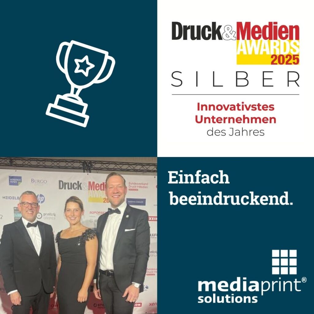 mediaprint solutions wurde erneut unter die besten Unternehmen der deutschen Druck- und Medienbranche gewählt – und sicherte sich bei den diesjährigen Druck&Medien Awards 2025 den 2. Platz in der Kategorie „Innovativstes Unternehmen“. Wir sind sehr stolz und freuen uns riesig über diese Auszeichnung!