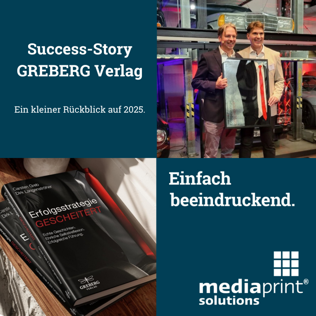 2025 konnten wir ein erstes Produktionsangebot ausarbeiten und die nächsten Schritte konkreter planen. In den darauffolgenden Monaten ging es vor allem um Beratung, Abstimmung und viele Details rund um Format, Materialien und Abläufe. Besonders wichtig war dabei die enge Zusammenarbeit im Projektalltag. Ein Dank geht hier auch an unsere mediaprint-Buchexperten Thorsten Vogt und Peter Möller, die das Projekt auf Produktionsseite begleitet haben. Im Oktober wurde schließlich der GREBERG Verlag von Dirk Langenströher und Carsten Greb gegründet und die Produktion beauftragt.